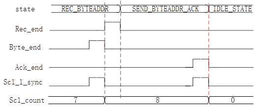 图7的作用是让大家知道rec_end标志的产生依据,和scl_count每计数到7和8的最后时刻,会产生一个byte_end和ack_end,byte表示一个字节传输结束,ack_end表示ACK应答位传输结束。