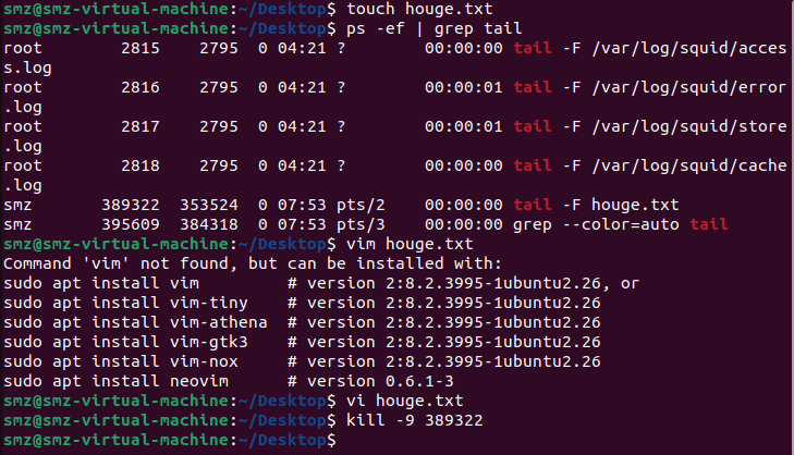 killall命令可以根据名称杀死进程,此处的进程名称是精确匹配。通常进程名称为启动命令中可执行文件的名称。对于tail -F houge.txt启动的进程,其进程名称为tail。