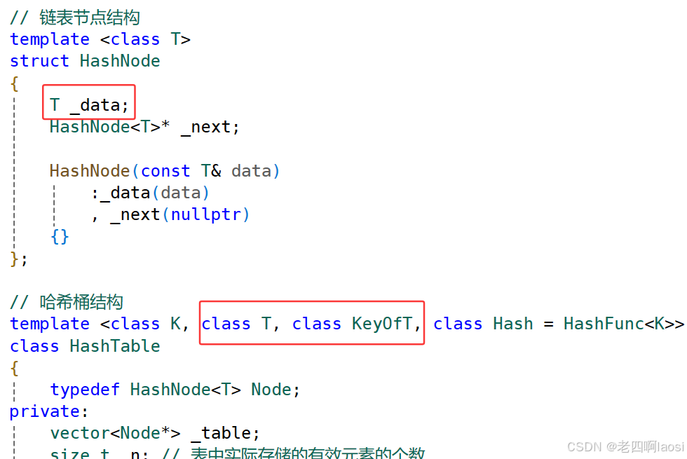 2) 同样是为了实现相同的比较逻辑能同时适合unordered_map和unordered_set,我们引入模板参数KeyOfT,用来取出是数据中的key ,仿函数由上层的unordered_map和unordered_set来传入,因为它们知道自己存储的具体是什么类型的数据,应该如何取出key。相应的原本要取key的位置都用仿函数套一下。