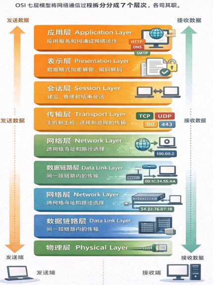 很多人刚开始学网络的时候,一看到 OSI 七层参考模型 就容易头大。应用层、表示层、会话层、传输层、网络层、数据链路层、物理层,一口气七层,名字一个比一个抽象。背是能背下来,可一旦问一句"它到底有什么用",很多人又有点说不清了。