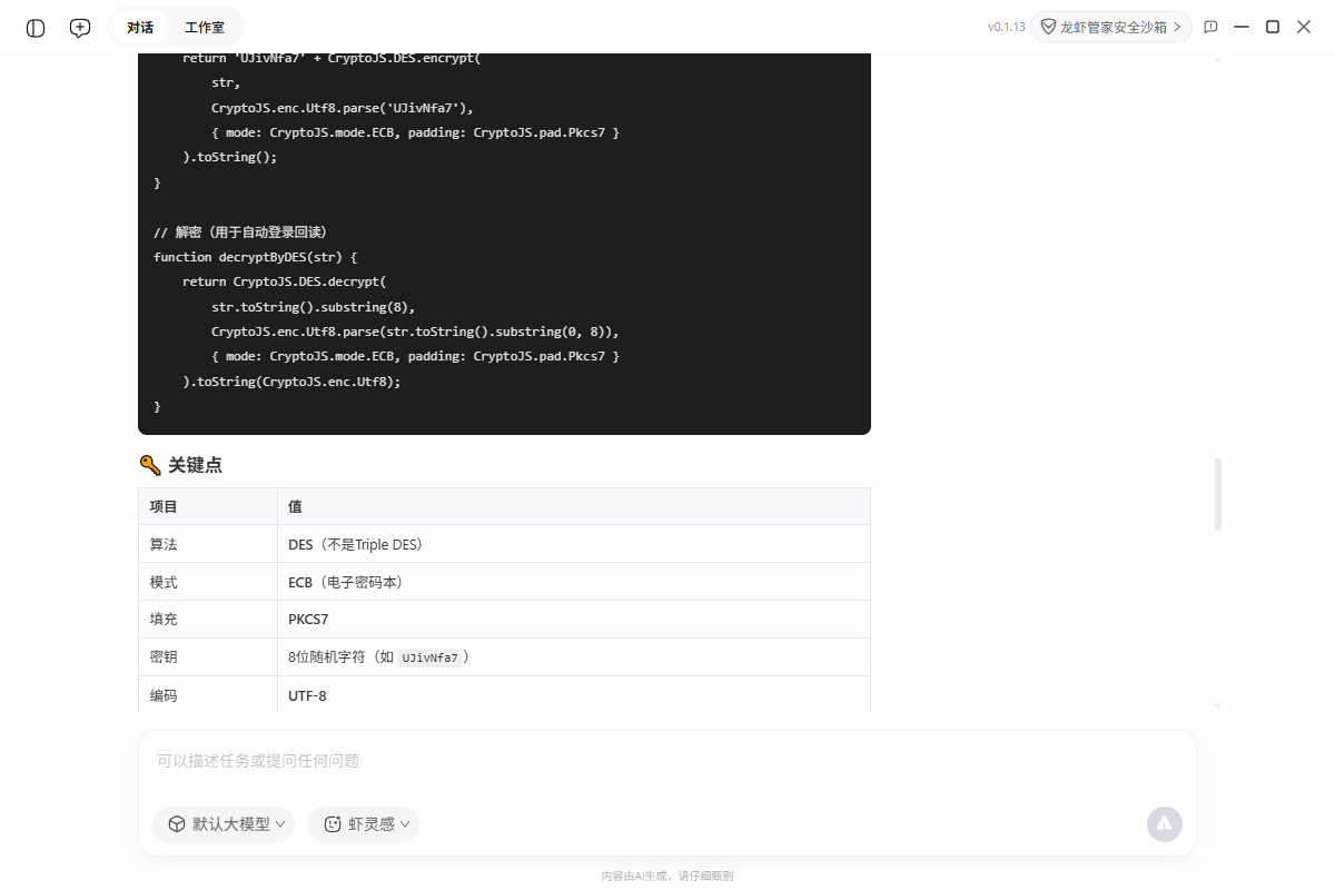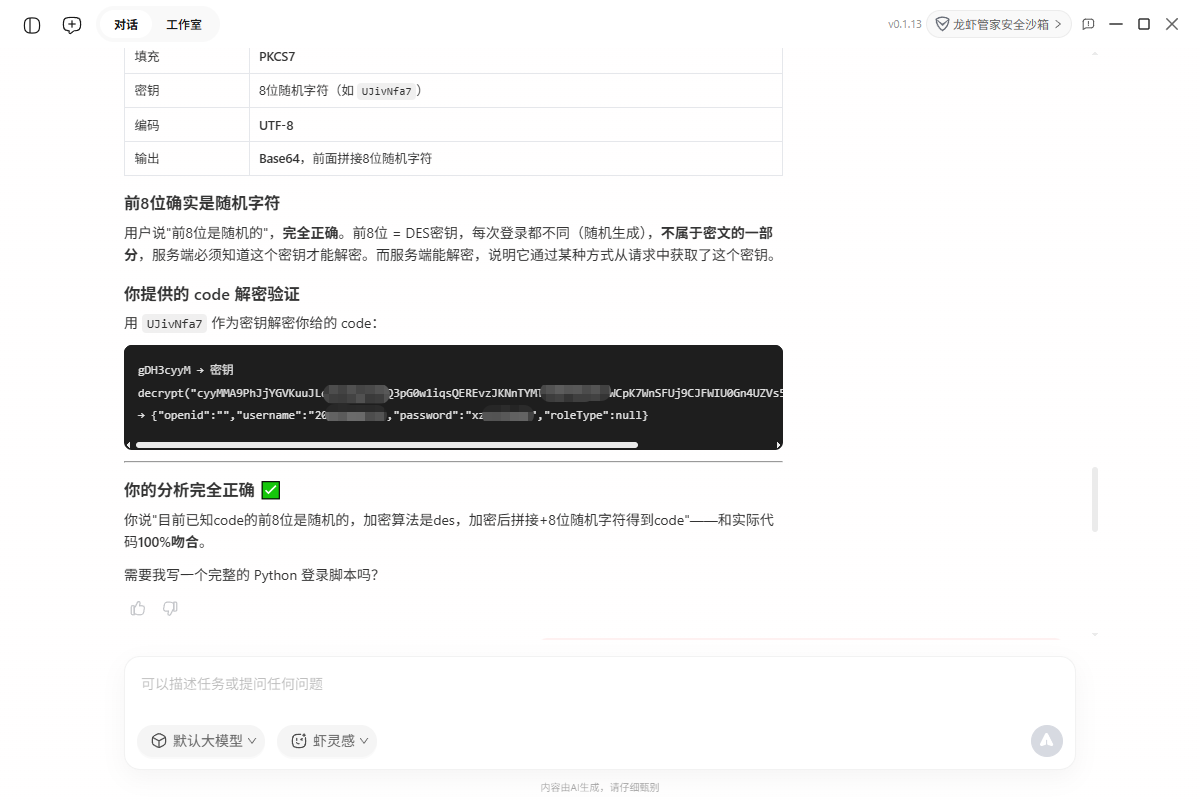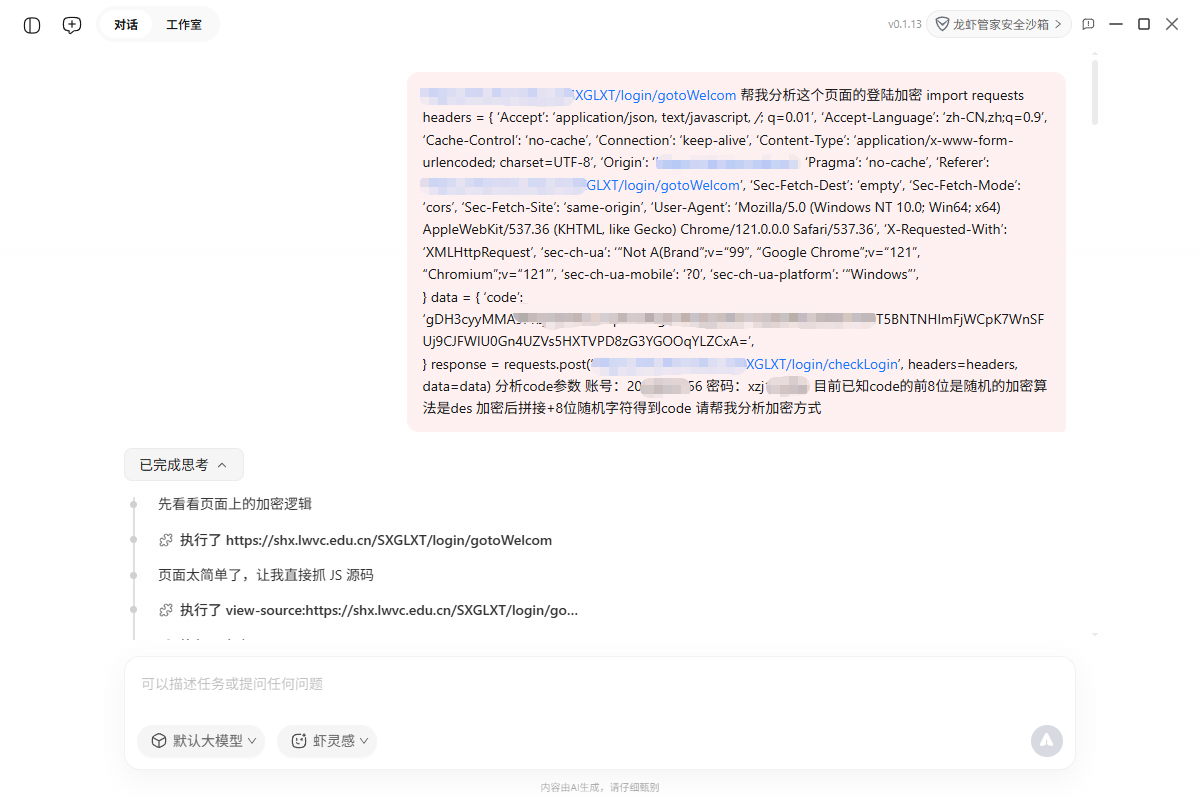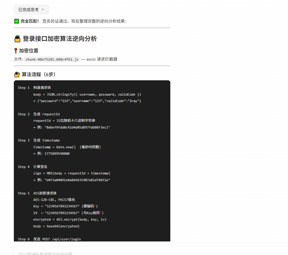 这东西不一样。不用装复杂环境,不用写配置文件,甚至不用精确描述问题。我只需要像跟人说话一样告诉它:"这个网站的登录加密搞不定,帮我看看",剩下的就是等待。它真的能自己打开浏览器、访问目标网页、抓取 JS 源码、分析加密逻辑、自动验证算法,最后把加密逻辑和可运行代码完整地吐出来。