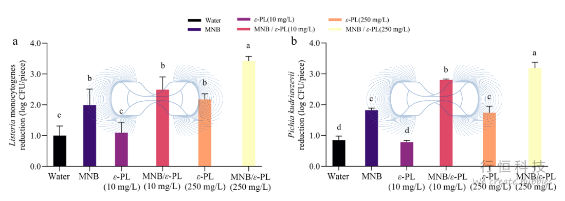 - L. monocytogenes :MNB/ε-PL(250 mg/L)处理5分钟,可实现3.43 log CFU/片的减少 ,效果显著优于单独水洗或MNB洗(减少量对比详见a)。