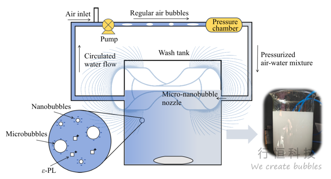 本研究针对传统化学消毒剂(如氯制剂)可能产生有害副产物、热加工可能损伤品质等问题,开发了一种创新的非热物理净化方法。空气微纳米气泡(MNB) 具有高比表面积、高气体溶解度和良好的稳定性,可提高净化剂与污染物表面的接触效率。**ε-聚赖氨酸(ε-PL)** 是一种天然、安全的抗菌肽(GRAS认证)。