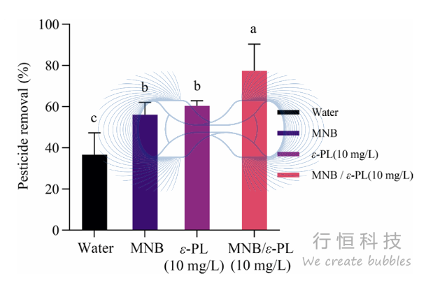 以敌百虫(trichlorfon)为目标农药,MNB/ε-PL(10 mg/L)联合处理显示出最高的去除效率,去除率达77.3%,显著高于单独水洗、MNB洗或ε-PL洗(不同处理对敌百虫的去除率对比):