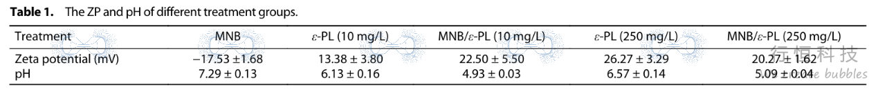 - Zeta电位 :单独空气MNB体系Zeta电位为负(约-17.53 mV),而加入带正电的ε-PL后,MNB/ε-PL混合体系的Zeta电位转为正值(约+20.27~+22.50 mV),这有助于其与带负电的微生物细胞结合(Zeta电位与pH值):