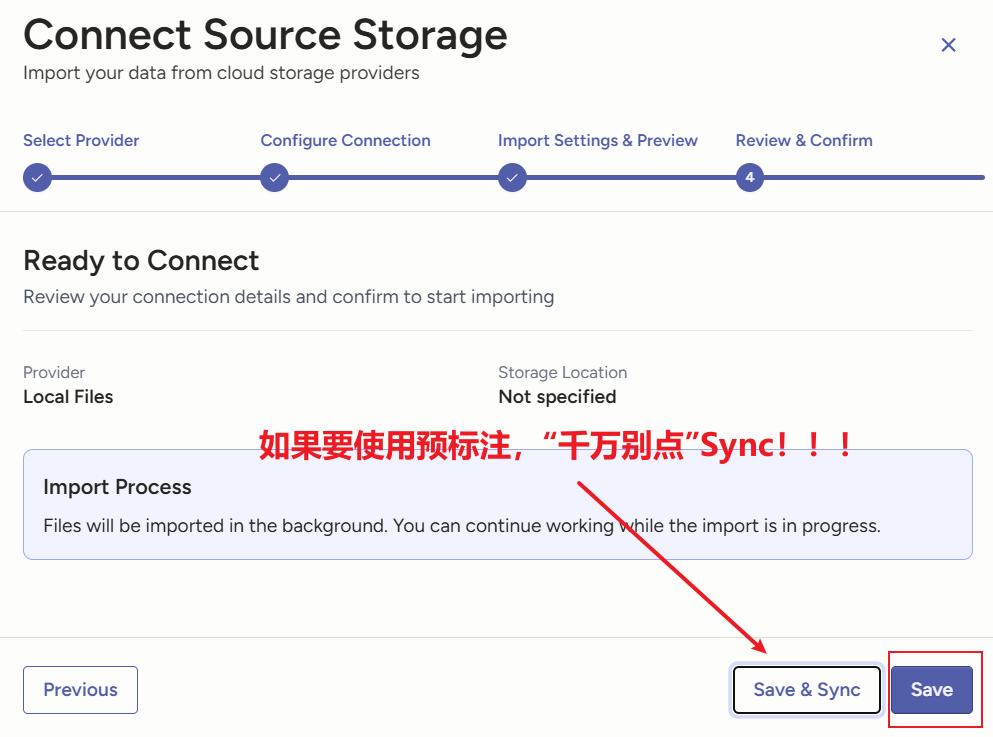 在 Label Studio 的新建一个项目,进入 Settings,选择 Cloud Storage,然后选择 Add Source Storage,然后选择 Local Files,点击 Next。依次按照下图所示操作: