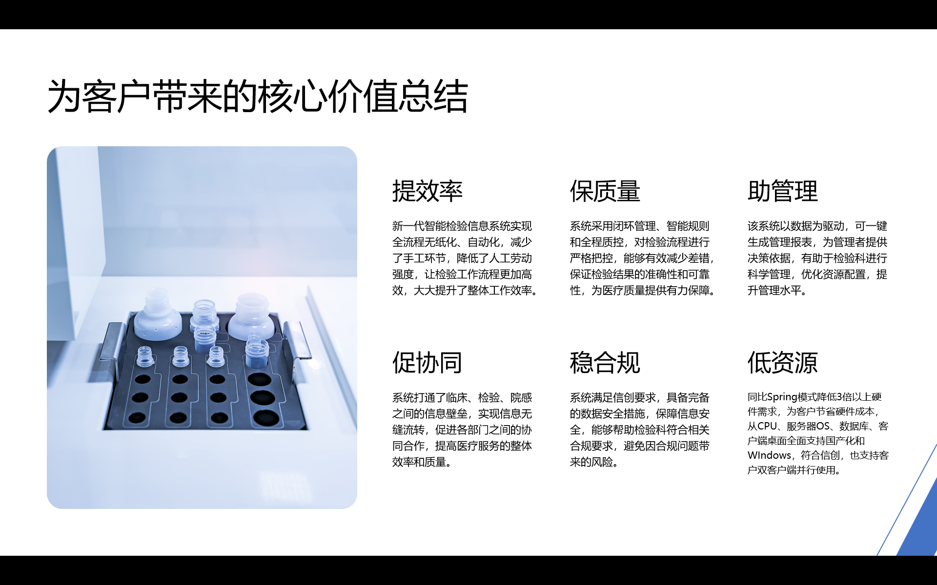 为验证方案切实可行,我们从最熟悉的检验系统切入,基于自研信创架构完成完整落地,为医疗及政企领域的信创改造,打造可复制、可规模化推广的标杆案例。同时平衡高可定制化和标准化,项目实现高度定制化,标品快速吸收项目改造迭代,为基于JRT的开发厂商提供订阅和定制两不误的模式。
