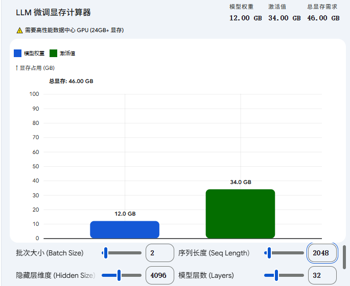 关键结论: 当你微调长文本(序列长度 s很大)或加大 Batch Size 时,激活值占用的显存会呈线性增长,甚至呈二次方增长(因为注意力机制中的注意力矩阵大小是 ),很容易远超模型权重本身占用的显存。