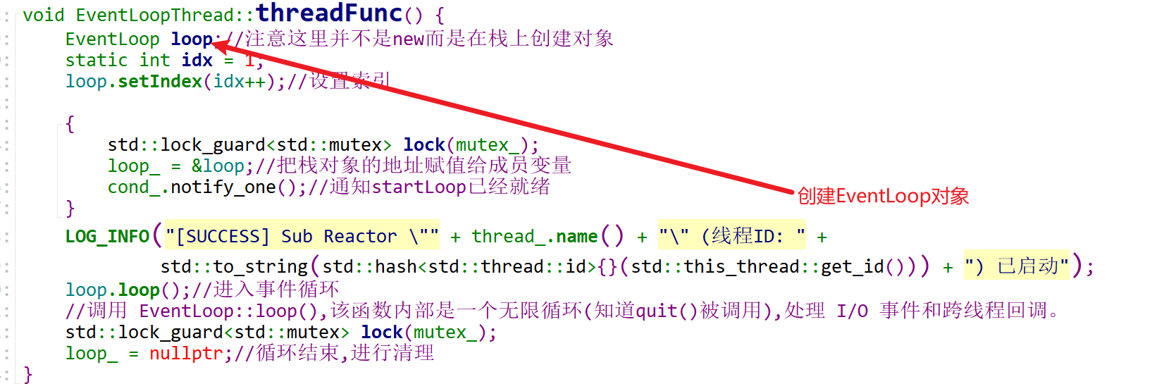 threadFunc()在栈上创建EventLoop对象,这样就有一个好处,生命周期与线程绑定,线程退出时自动销毁,无需手动进行delete。