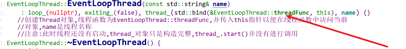 这个Thread类的构造函数的第一个参数是一个回调函数。被绑定到了threadFunc,也就是说Thread构造时就会回调threadFunc这个回调函数。