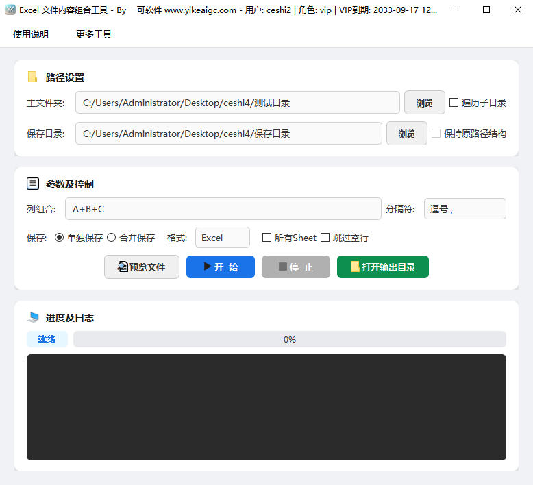 【批量Excel文件内容组合工具】的用途很明确:批量读取 Excel/CSV 文件,把指定列按规则组合拼接后输出,支持单独保存或合并保存,并提供预览、进度、日志与统计。