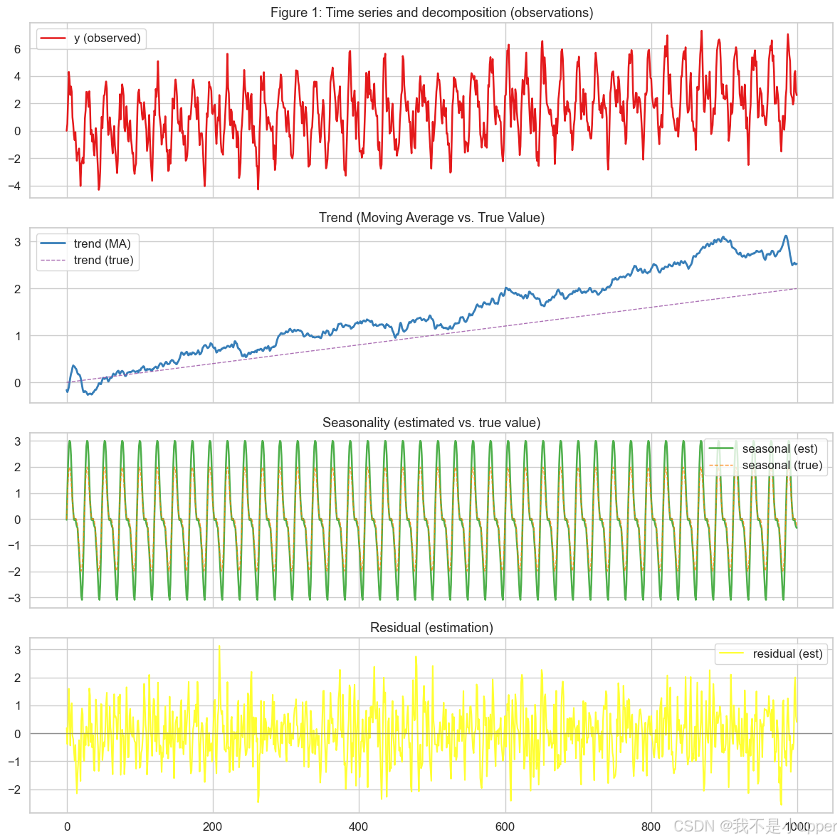 这张图帮助你确认数据里同时存在缓慢上升趋势和明显的周期振荡。移动平均估的趋势和真实趋势线形相近,说明平滑后取近似趋势可用;季节性估计的波形大体贴近真实季节波形。残差图应该在 0 附近波动,没有强烈的系统性结构。