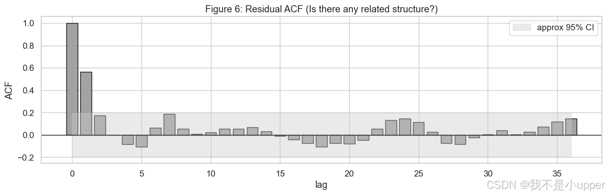 # 11) 附加图6:残差的 ACF(看是否还有结构)