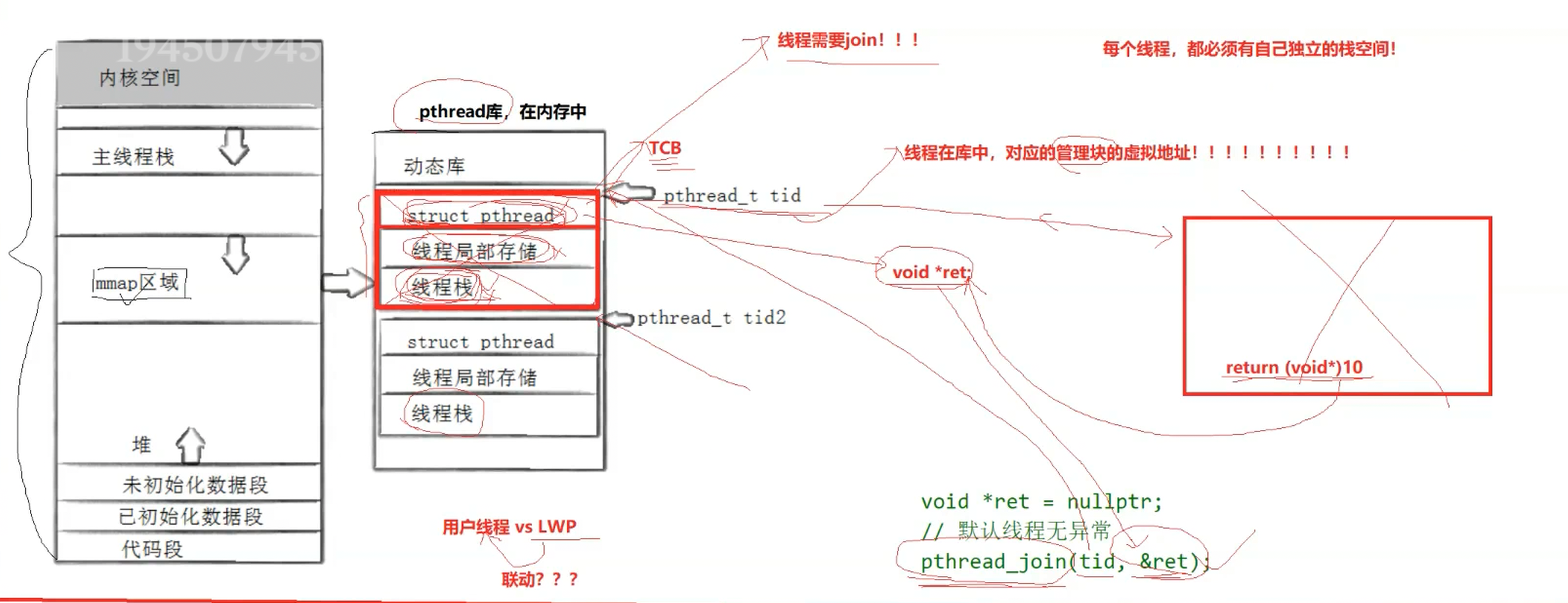 新线程结束后,轻量级进程会结束,但struct _pthread,线程局部存储,线程栈等空间默认情况下是不会被自动释放的,这也就是需要使用join函数进行回收的原因,值得一提的是,join的参数之一为tid,而tid又是struct _pthread的起始地址-》类似malloc与free- Linux中用户级线程(struct _pthread)与内核级线程(LWP)是1 : 1的,其他操作系统可能使1 : N的
