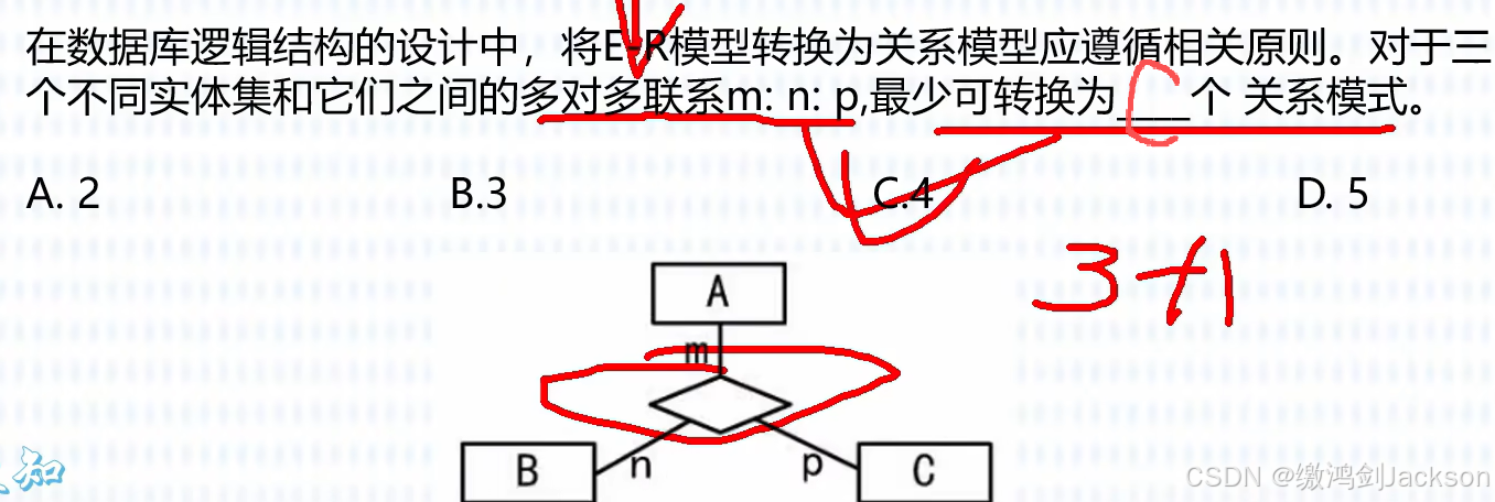 综上,此题一共可以转换的关系模式数量 = 3 (三个实体)+ 1(一个多对多关系) = 4