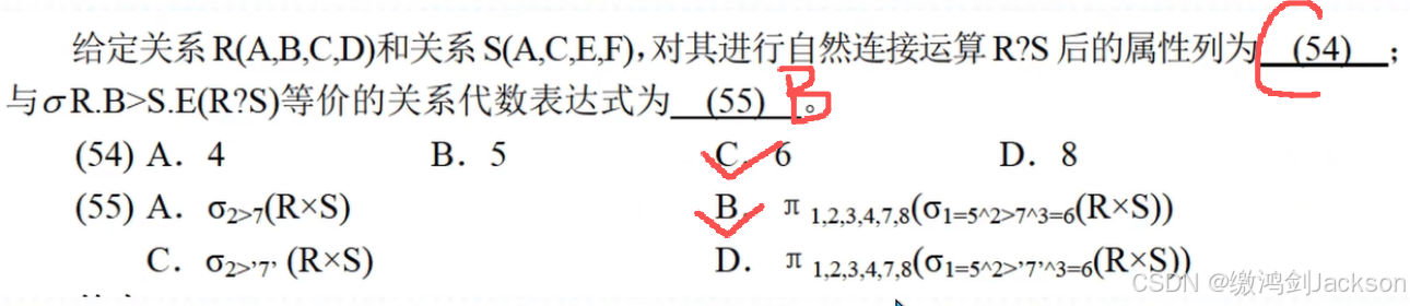 - σ后面的1=5 2>7 3=6就是三个条件,其中1=5和3=6说白了就是自然连接的条件,即R.A = S.A 和 R.C = S.C(即重复的那两列)。而2>7就是R.B>S.E的意思(这也是题目给的条件)