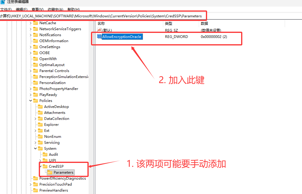 - 找到注册表项:计算机\HKEY_LOCAL_MACHINE\SOFTWARE\Microsoft\Windows\CurrentVersion\Policies\System\CredSSP\Parameters