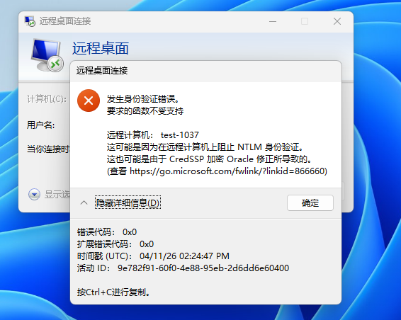 在windows 11上通过远程桌面连接到服务器(windows server 2012r2)时报错:发生身份验证错误。 要求的函数不受支持,远程计算机: test-1037 这可能是因为在远程计算机上阻止 NTLM 身份验证。这也可能是由于 CredSSP 加密 Oracle 修正所导致的。(查看 https://go.microsoft.com/fwlink/?linkid=866660),如下图所示: