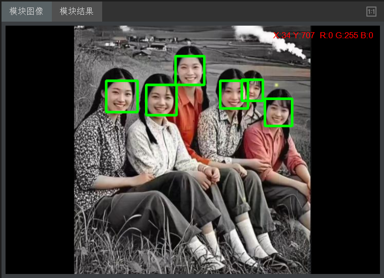 说明:返回值faces 为各人脸的位置矩形框,通过遍历可获取位置及绘制显示,效果如下图。