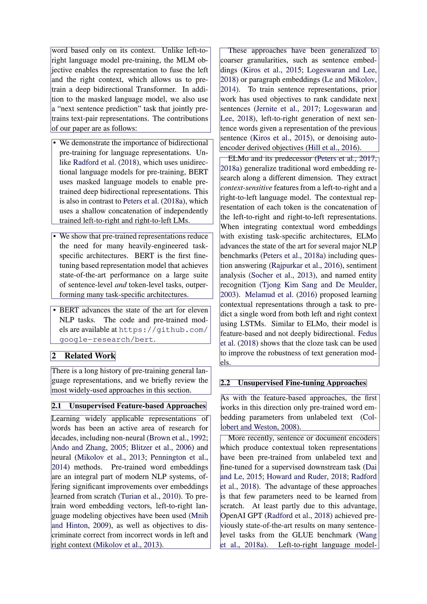 LayoutElement(bbox=Rectangle(x1=851.1539916992188, y1=181.15073777777613, x2=1467.844970703125, y2=587.8204599999975), text='These approaches have been generalized to coarser granularities, such as sentence embed- dings (Kiros et al., 2015; Logeswaran and Lee, 2018) or paragraph embeddings (Le and Mikolov, 2014). To train sentence representations, prior work has used objectives to rank candidate next sentences (Jernite et al., 2017; Logeswaran and Lee, 2018), left-to-right generation of next sen- tence words given a representation of the previous sentence (Kiros et al., 2015), or denoising auto- encoder derived objectives (Hill et al., 2016). ', source=<Source.YOLOX: 'yolox'>, type='Text', prob=0.9519357085227966, image_path=None, parent=None),