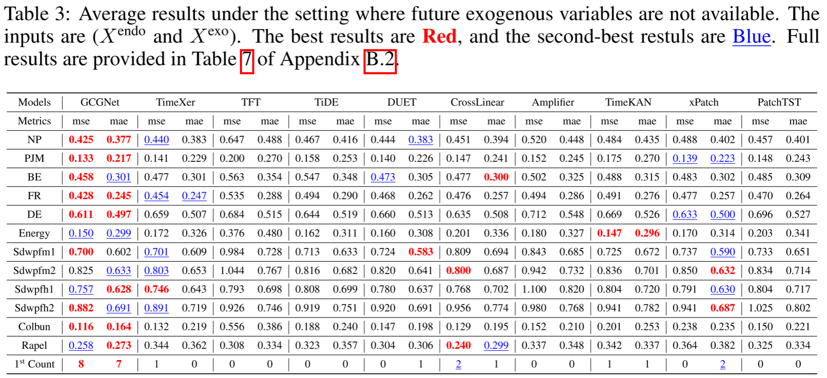 在有未来外生变量的设置下,GCGNet 与 10 个基线(包括 TimeXer、TFT、TiDE、DUET、CrossLinear、PatchTST 等)对比: