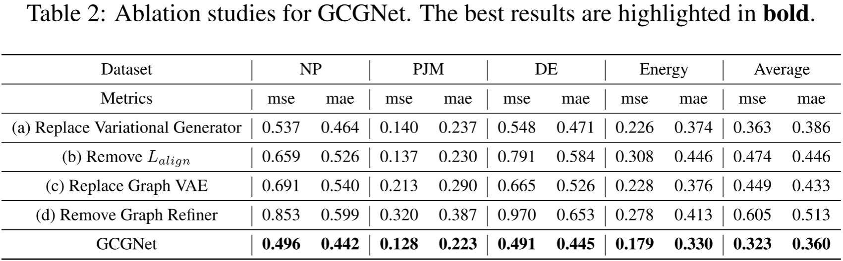 | Graph VAE | 相关性表示的去噪和鲁棒性 | 替换为确定性图学习器后MSE上涨39% |