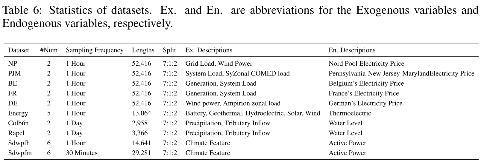 | 电力价格 | NP, PJM, BE, FR, DE | 电网负荷、风电预测等 | 电力价格 |