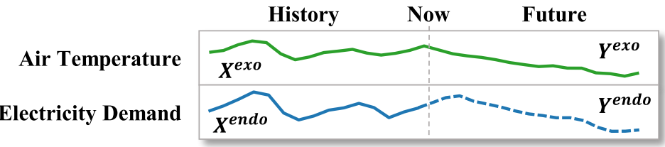 论文 Figure 1 ------ 展示历史/未来时间轴上电力需求与气温的关系示意图