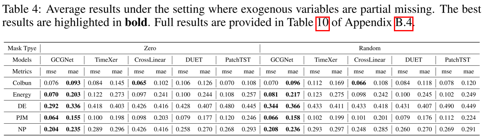 通过将 10%、30%、50% 的外生变量替换为 0 或随机噪声来模拟缺失,GCGNet 在所有场景下均保持最佳性能,证明了生成网络设计的鲁棒性。