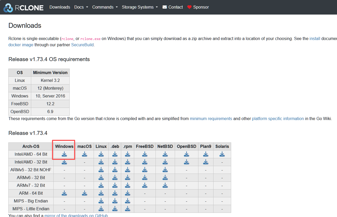 - 下载 Rclone Windows 64-bit 压缩包。https://rclone.org/downloads/