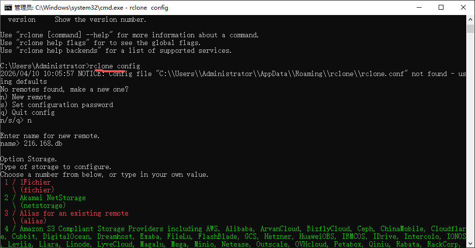 在 Windows 终端执行 rclone config,按照以下逻辑配置: