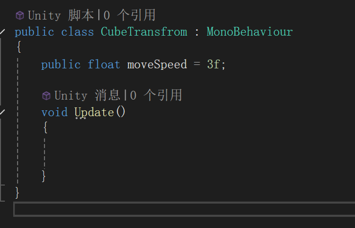 然后我们在使用Update方法,这个方法会在Unity运行后的每一帧去调用。