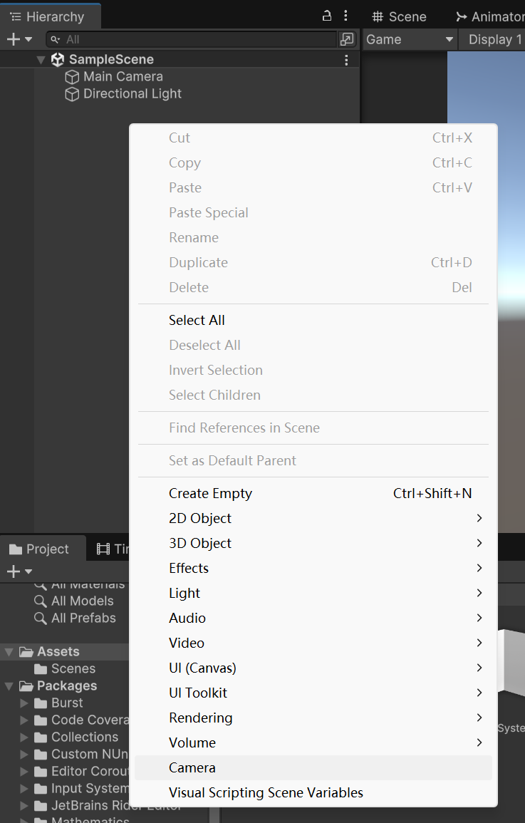 层级中-》鼠标右键-》Camera 这就是Unity的摄像机点击后就可在场景内创建一个摄像机对象