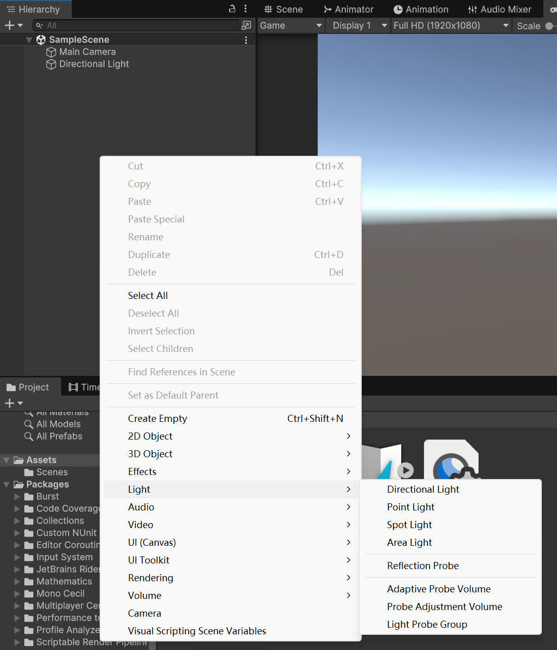 层级中-》鼠标右键-》找到Light 这里面对应的就是Unity自带的灯光效果等 选择后将会在场景中创建对应灯光效果
