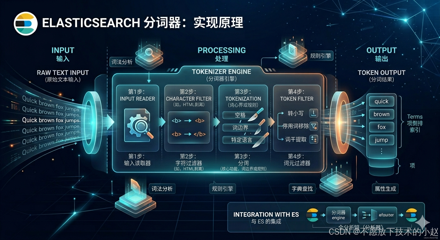 ES分词器(Analyzer)是一个文本处理流水线,由四个有序步骤组成,每个步骤都有特定的职责: