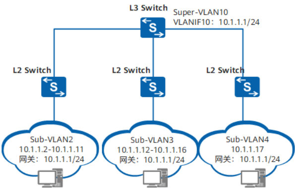 - 应用 :使用一个 Super VLAN 作为所有用户VLAN(Sub-VLAN)的统一网关,所有用户共享同一个IP地址段。Sub-VLAN之间在二层隔离,通过Super VLAN的代理ARP功能实现三层互通。