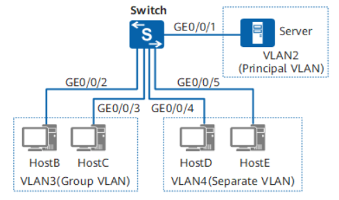 Server和HostB、HostC、HostD、HostE二层流量互通。(sever在主vlan与所有都互通) HostB和HostC二层流量互通。(同一个互通型从vlan) HostD和HostE二层流量不通。(同一个隔离型从vlan) HostB、HostC和HostD、HostE二层流量不通。(不同从vlan不互通)