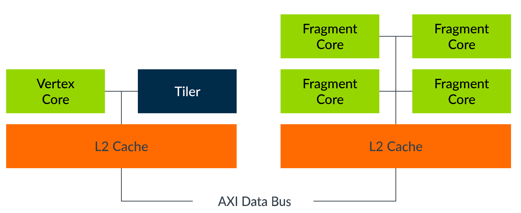 Utgard GPU采用两种不同的着色器核心设计------顶点着色器和片元着色器,所有Utgard GPU均支持单个顶点着色核心,而硅芯片中着色核心的具体数量则因芯片型号而异。Arm向各芯片合作方提供可配置设计授权,合作方可根据自身性能需求与芯片面积限制,灵活配置其特定芯片组中的GPU:例如Mali-400和Mali-470最多支持四个片段着色器核心,Mali-450则最多支持八个。