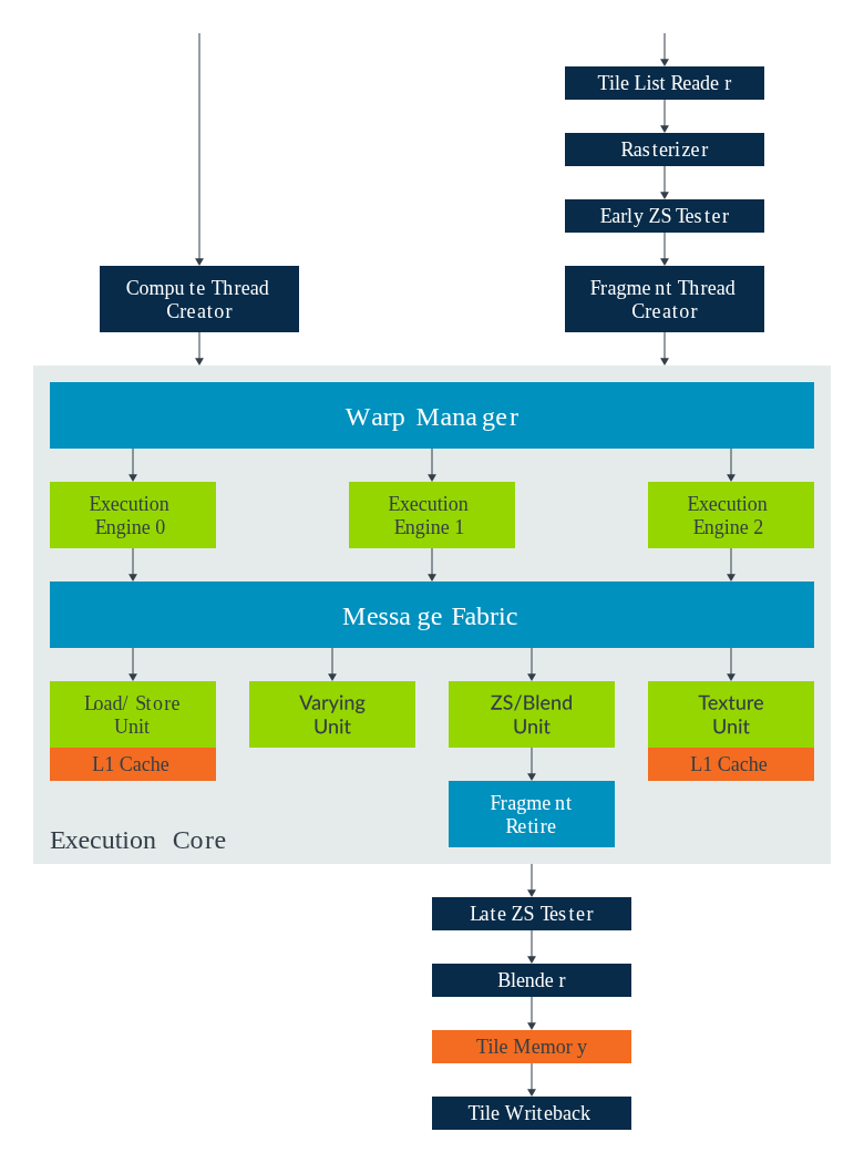 - 执行引擎(EE)。每个执行引擎(EE)负责执行可编程着色器指令,包含一个复合算术处理流水线,以及当前处理线程所需的线程状态,是实现着色器程序执行的核心单元。