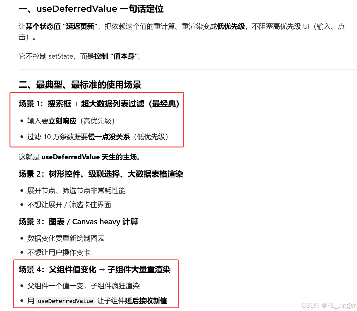 在大量数据渲染、搜索过滤这类高耗性能场景里,如果不用并发 API,状态更新是同步的,会导致渲染阻塞主线程,输入框、按钮都会卡顿。