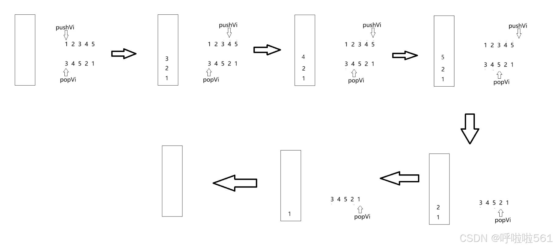 while(!st.empty()&&st.top()==popV[popVi])//只要栈不为空并且栈顶元素等于要出的元素,则弹出栈。