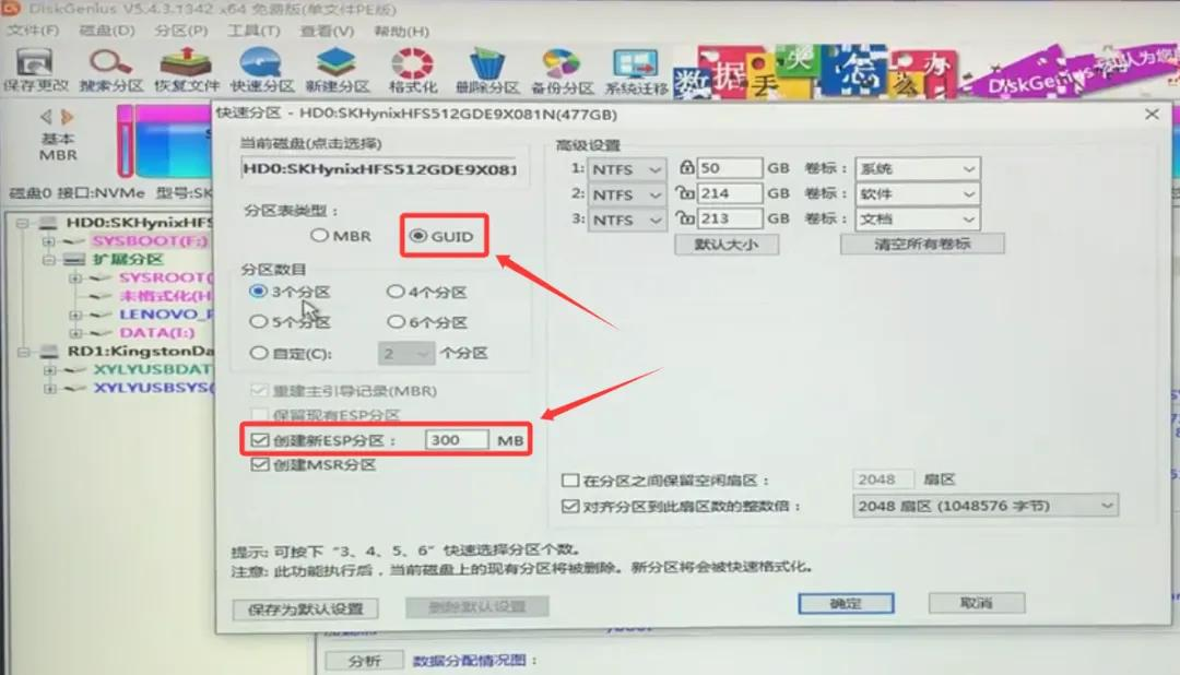 运行DiskGenius分区工具,右键点击硬盘,选择"转换分区表类型为GUID格式"(即GPT格式)。如果是新硬盘,可以直接快速分区,同样选择GUID分区表类型。记得勾选"对齐到下列扇区数的整数倍",确保4K对齐。