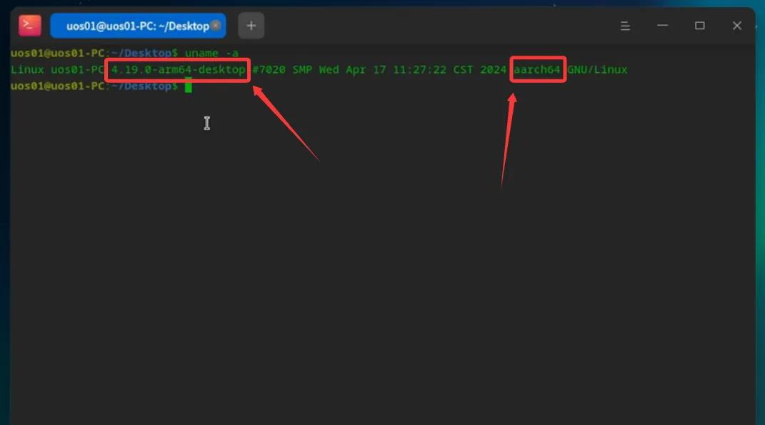 **UOS系统:**打开终端,输入 uname -m,输出 x86_64 为X86架构,aarch64 为ARM架构。