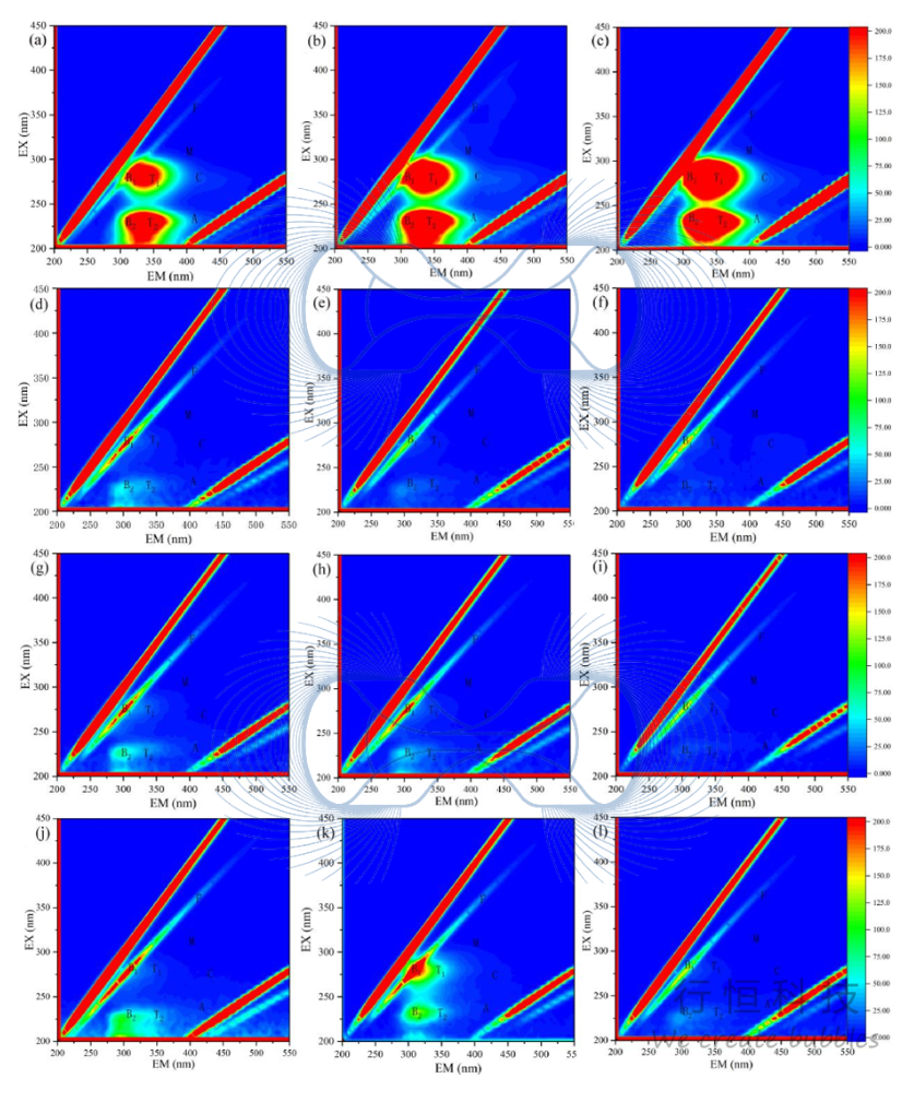 通过三维荧光光谱分析发现,臭氧微气泡能有效去除各类藻源有机物。对于胞外有机物,能强化去除疏水性高、分子量大的富里酸、腐殖酸类物质 ;对于以芳香类蛋白物质为主的胞内有机物,高浓度臭氧可有效氧化破坏其结构(不同臭氧投加量下,胞外与胞内有机物的三维荧光光谱图):