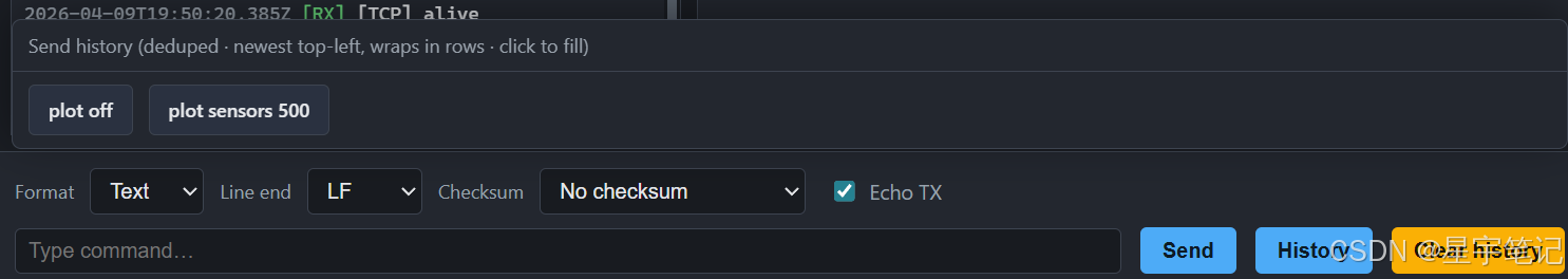 这些在很多轻量工具里都不完整,但实际上很常用。README 里当前已实现的发送能力包括 Text / HEX 模式、行尾控制、校验算法、TX 回显、Enter 发送、发送历史。