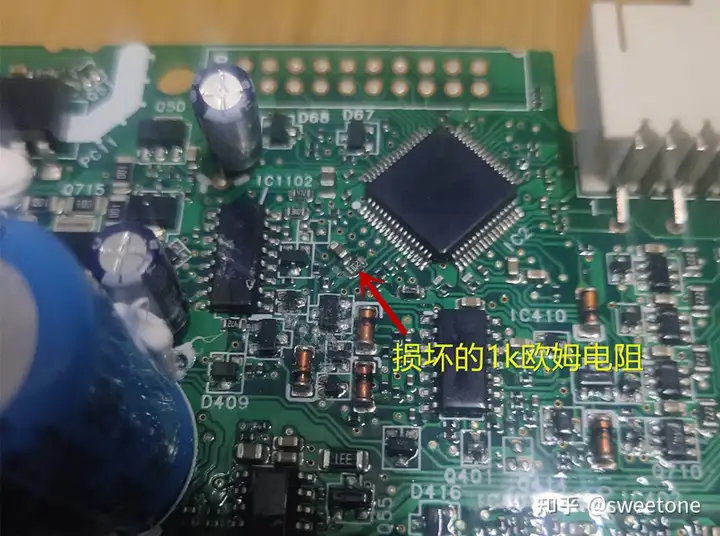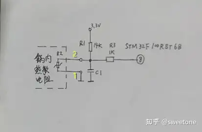 再在线路板上查找测温线路,经过仔细查找,测绘出测温电路如图所示:R2是锅内的热敏电阻。R1是上拉电阻,接3.3V供电端,用以与R2分压。C1是抗干扰滤波电容。R3是耦合电阻,将在R2上分压的电压输入主控芯片STM32F100RBT6B的温度检测输入端8脚。实测R1为14K欧姆,3.3V供电端对地内阻是1K欧姆左右,所以测量出锅子底座上1,2针之间阻值只有15K欧姆是对的,15K欧姆其实是R1阻值14K欧姆与3.3V供电端对地内阻1K欧姆之和。再测出R3阻值是103K欧姆,与其标称值1K欧姆相差太大,估计已经损坏。该电阻增大一百多倍,使得输入主控芯片温度检测输入端8脚的电压被严重衰减,所以使得主控芯片以为锅内温度过高而提示异常及保护。