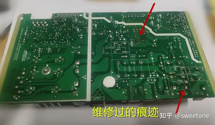 拆开机器查看,锅子底座的排线是连接到主板上的。拆下主板观察,主板上电源芯片有换过的痕迹,继电器也有焊接过的痕迹。看来该机修理过,于是先查看主板一遍,没有找到异常故障痕迹。