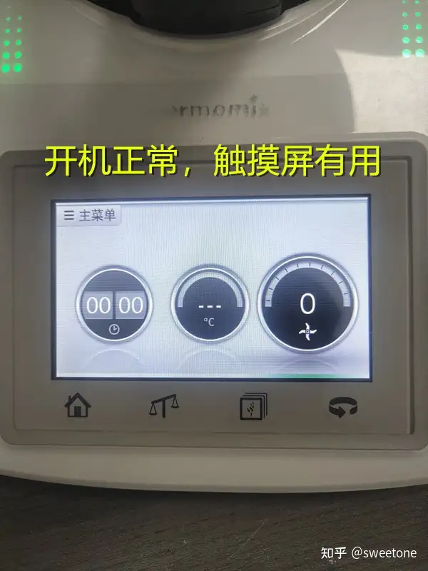 将故障电阻换新的1K欧姆电阻。再将主板以及所有部件装好,将锅子放在料理机上。按电源键开机,机器能够进入主菜单,"当主锅内温度下降到85度后,主锅盖将会自动解锁"的提示已经不再出现。操作触摸屏,机器有反应;旋转旋钮,机器也有反应。看来,机器测温异常故障已经排除。