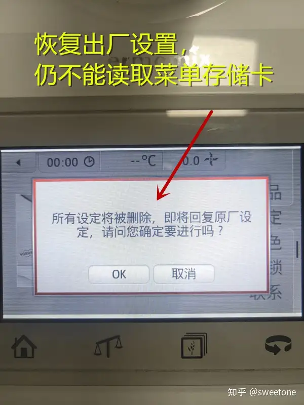 试着操作料理机自带的煮白米饭,原味酸奶,卡士达三种烹饪功能,料理机的电机,加热运行正常。但是试着选择外接THERMOMIX(美善品)食谱存储卡内的菜谱进行操作的话,料理机提示"需要连接存储卡"。该料理机的优势就是其电子菜谱的交互性,若没有此功能,该料理机还不如一台多功能智能电饭煲。试着安装存储卡数次,料理机仍旧是有该提示。在料理机菜单里将机器恢复出厂设置,料理机也仍旧是该提示。
