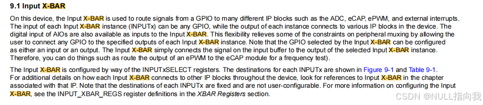 On this device, the Input X-BAR is used to route signals from a GPIO to many different IP blocks such as the ADC, eCAP, ePWM, and external interrupts.**翻译:**Input X-BAR 的作用,就是把 GPIO 的信号,路由到 ADC、eCAP、ePWM、外部中断等不同的 IP 模块。
